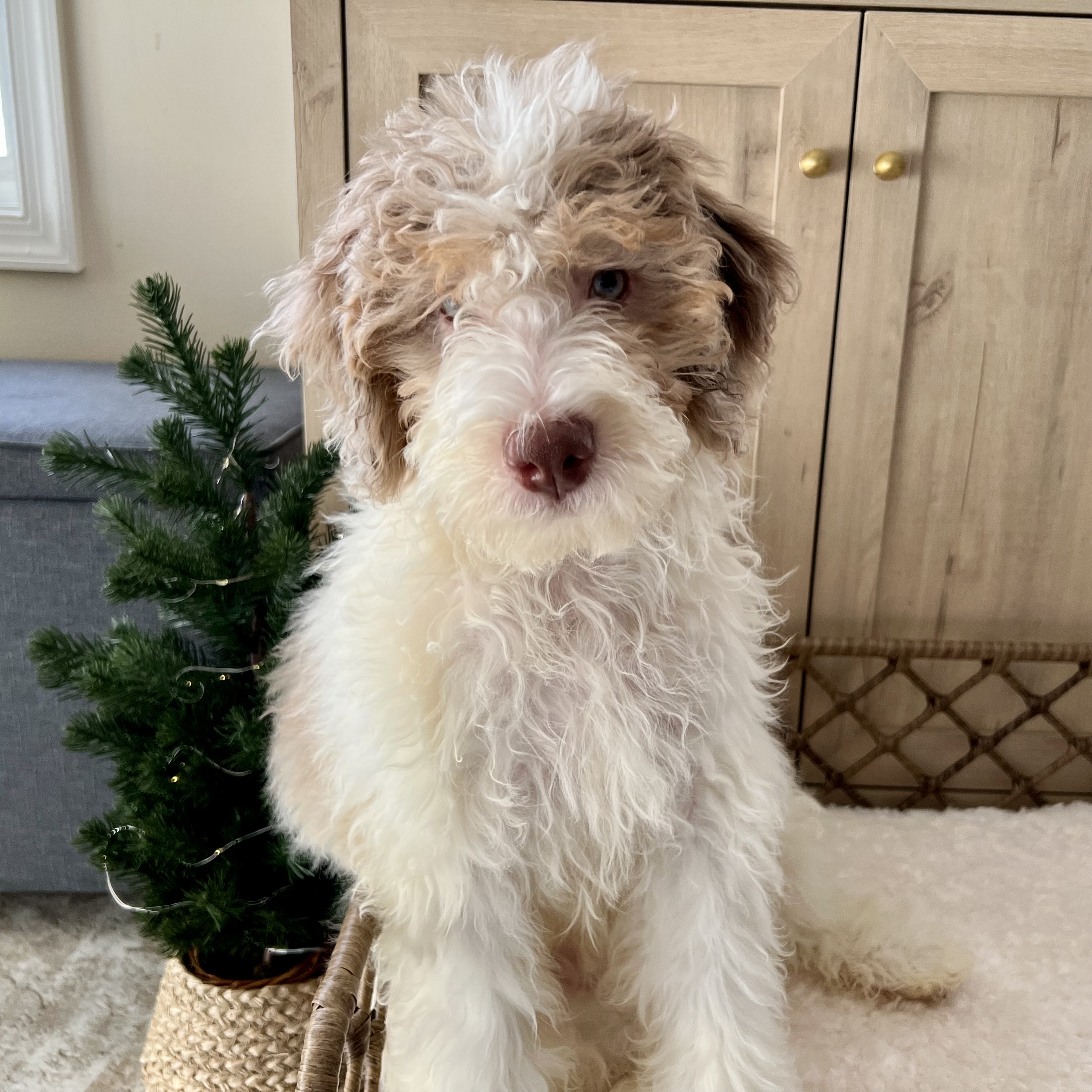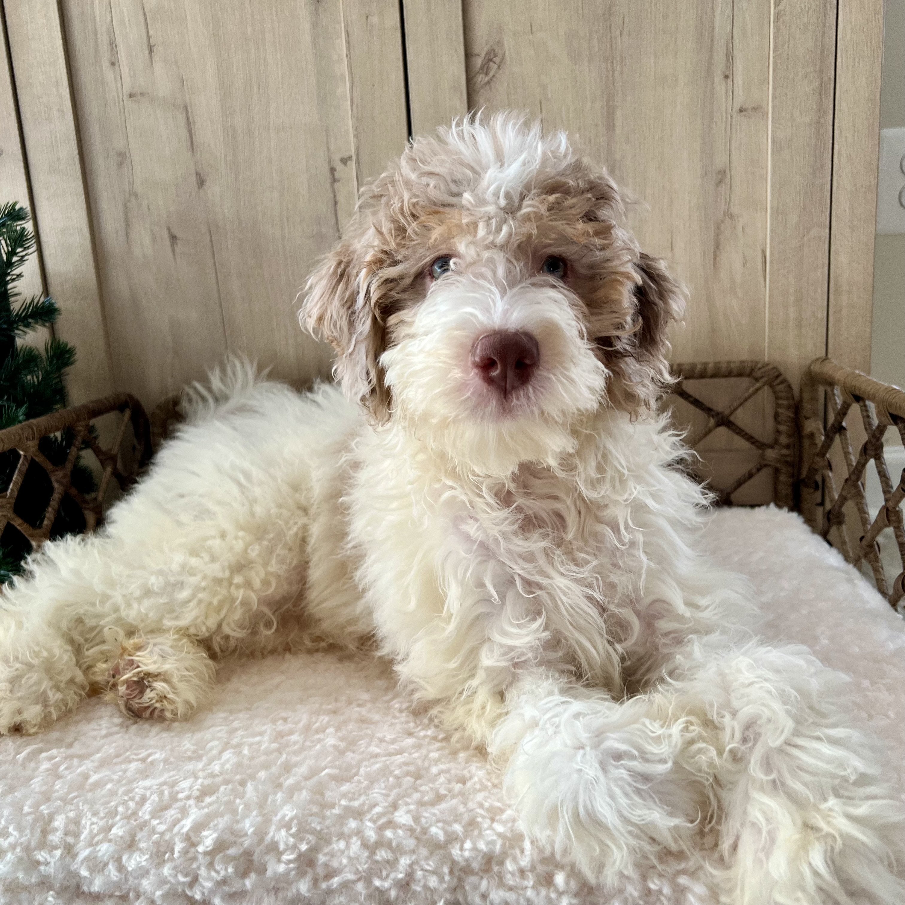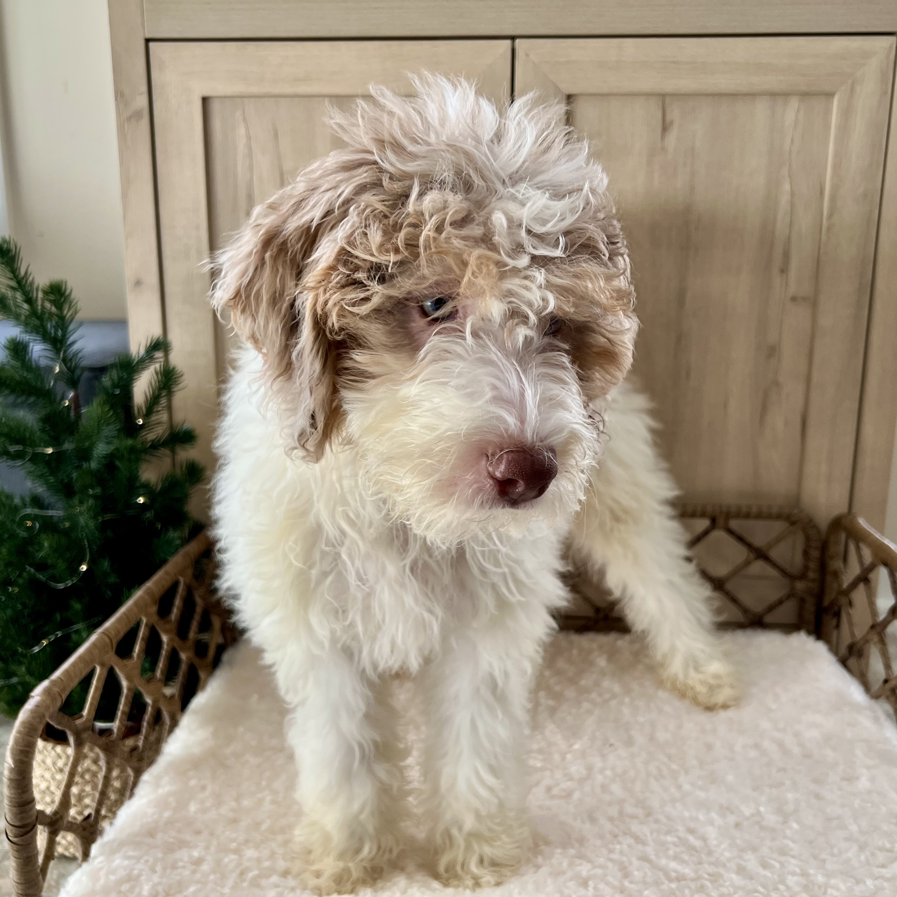 Glinda is an absolutely delightful puppy whose golden personality matches her beautiful bicolor blond coat. With her gorgeous curly-wavy fur and spirited nature, she's sure to brighten every day of your life together.