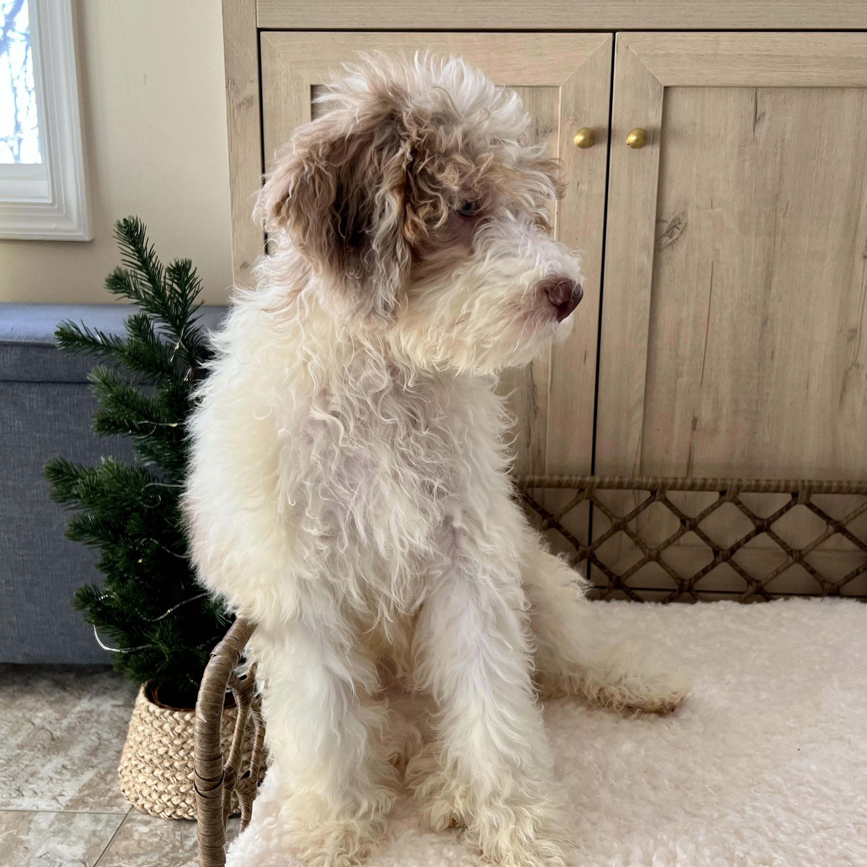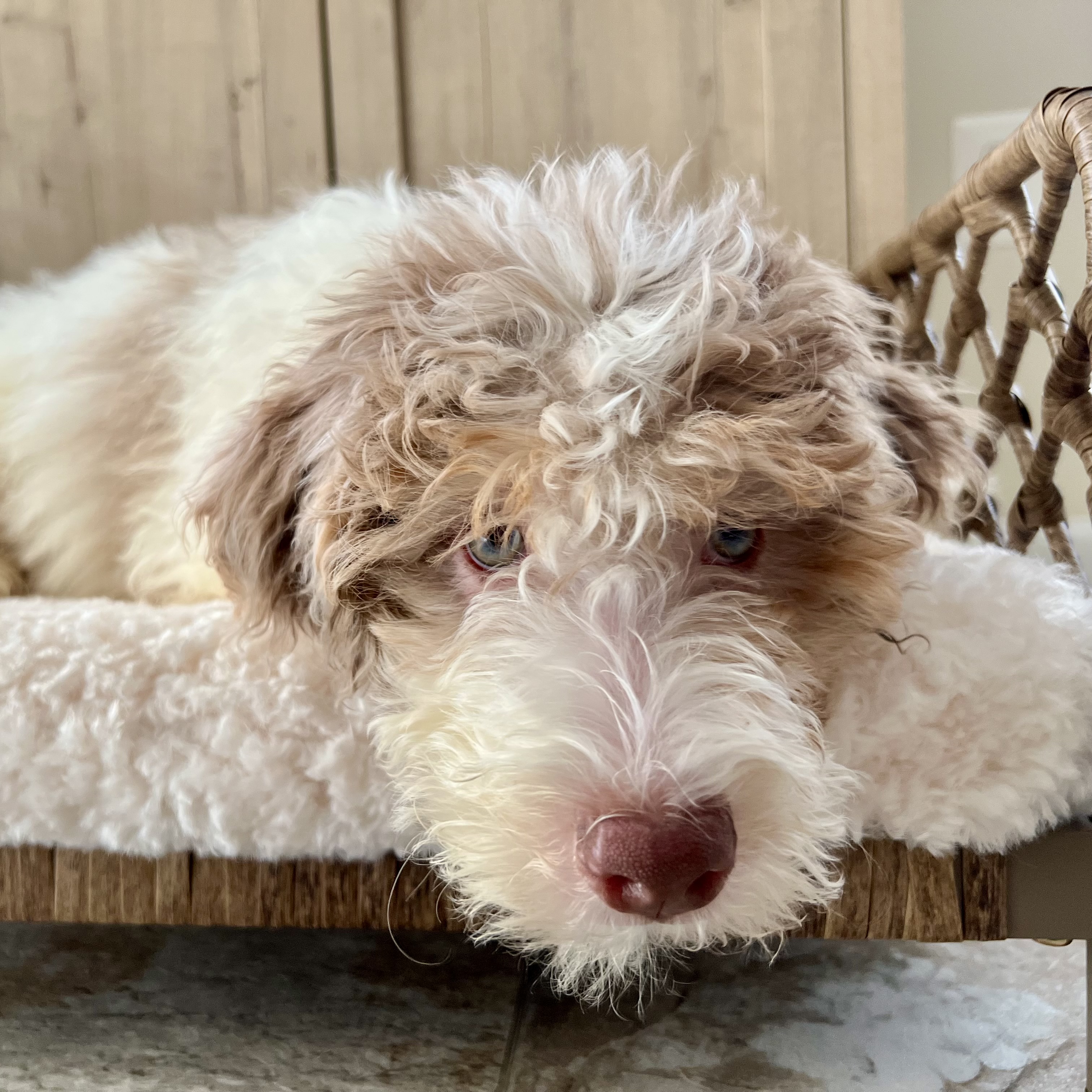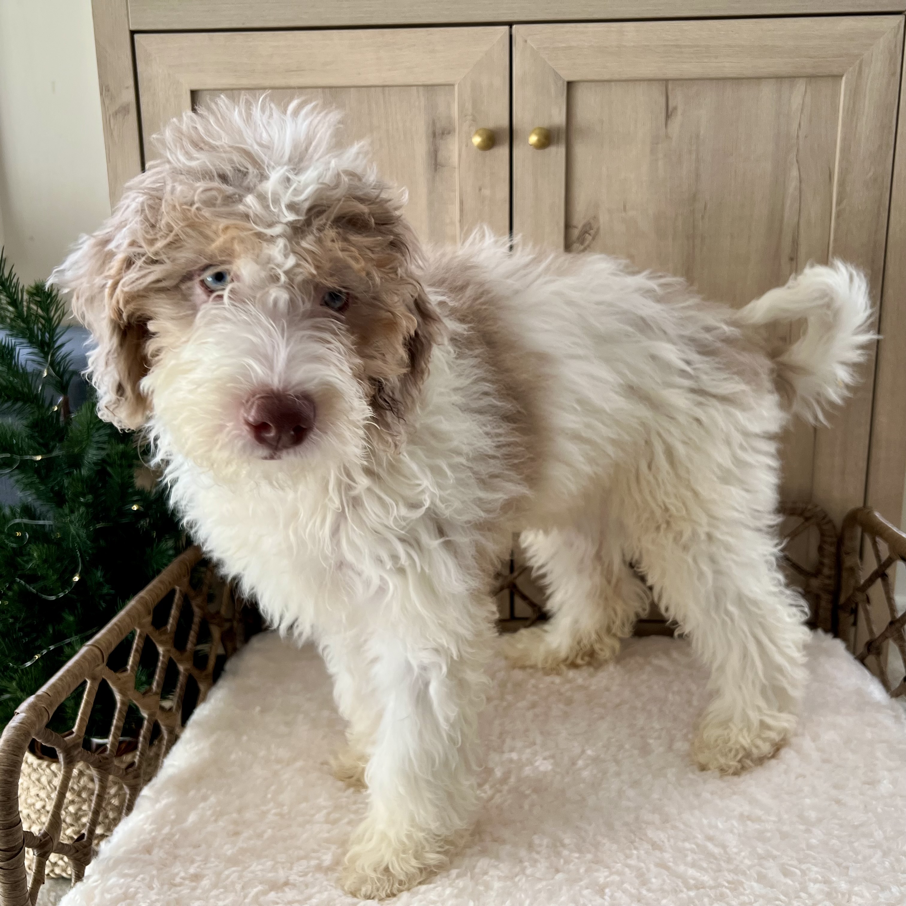 Glinda is an absolutely delightful puppy whose golden personality matches her beautiful bicolor blond coat. With her gorgeous curly-wavy fur and spirited nature, she's sure to brighten every day of your life together.